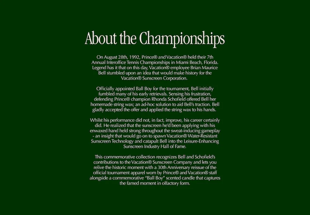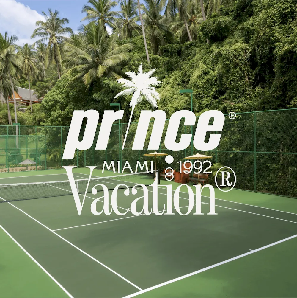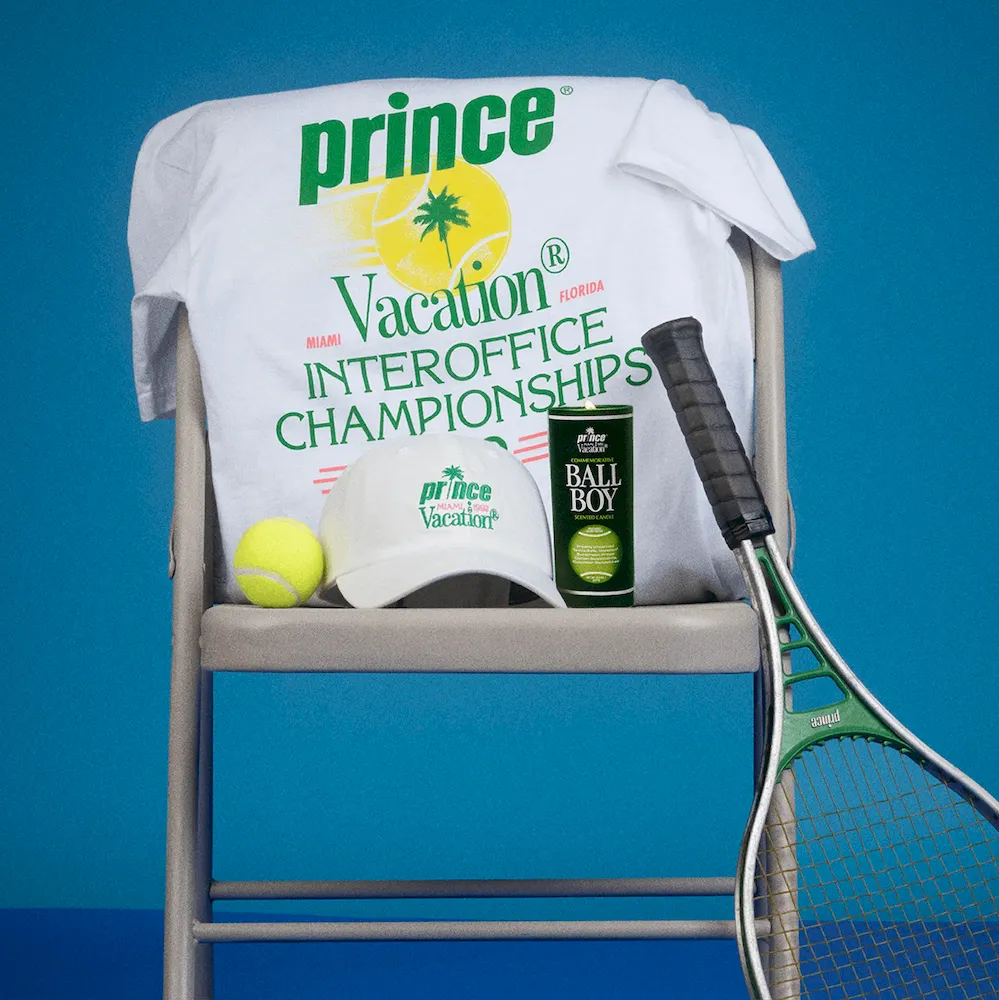 A luxury scented candle commemorating the historic Prince® x Vacation® 7th Annual Interoffice Tennis Championships with notes of freshly uncanned tennis balls, Vacation® Sunscreen, Prince® Cotton Sweatbands, and cucumber sandwiches.