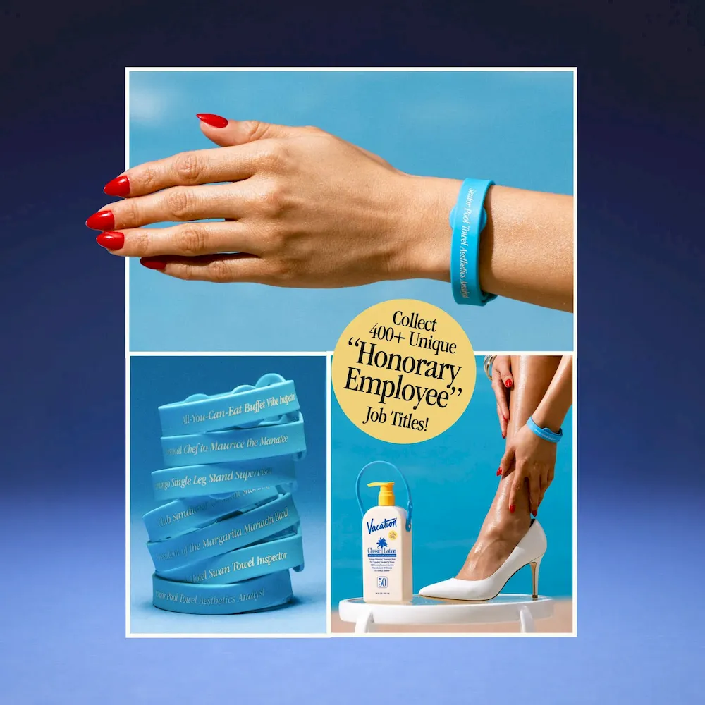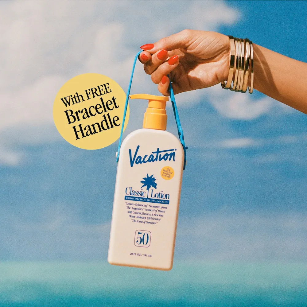 A value-optimizing 20 fl oz bottle of “The World’s Best-Smelling Sunscreen.” Featuring a deluxe PowerPump™ applicator for high-speed application and a detachable handle that repurposes into a Vacation® “Honorary Employee” Bracelet — the perfect accessory for every leisure professional.