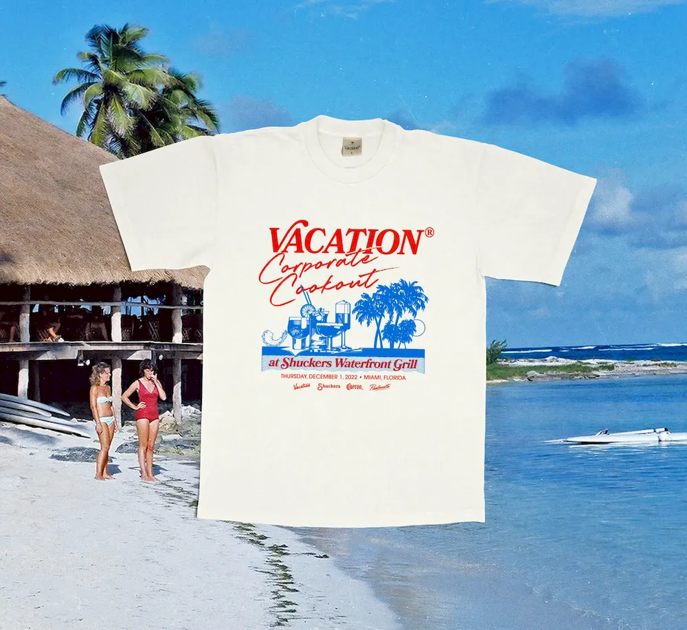 Honor unforgettable seafood, cocktails, and memories with the Vacation® Corporate Cookout T-Shirt. A 100% Premium Woven Cotton “T-Shirt” to commemorate the 2022 Vacation® Corporate Cookout at Shuckers Waterfront Grill.