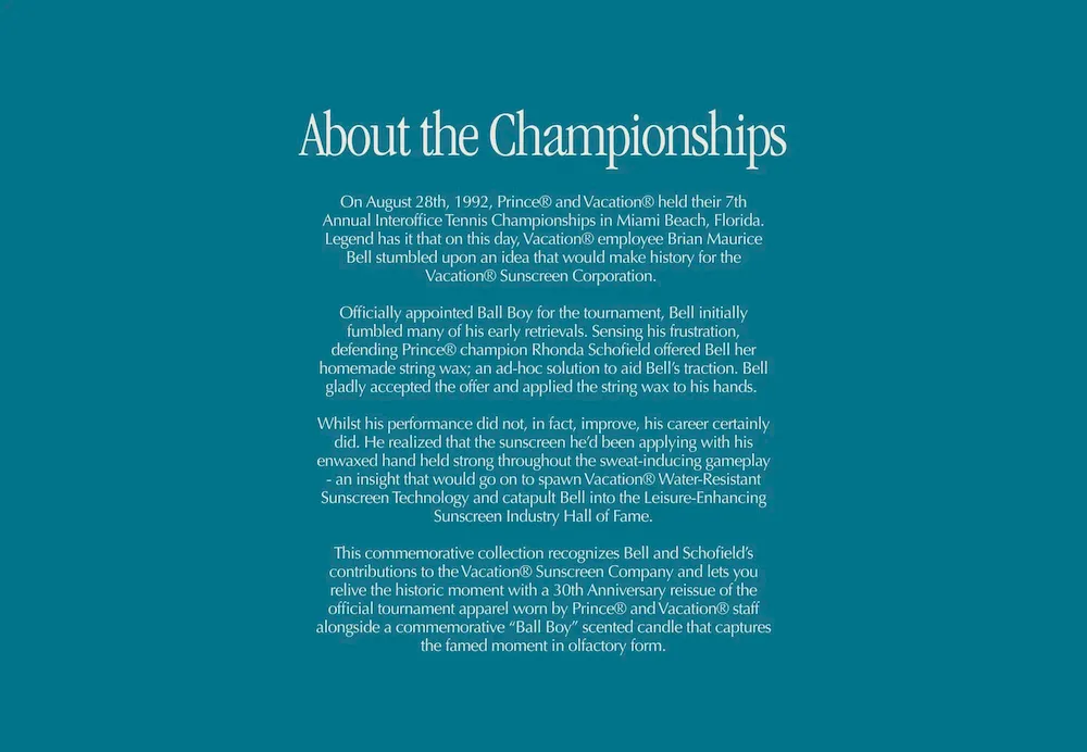 Commemorate the famed Prince® x Vacation® 7th Annual Interoffice Championships held in August 1992 with this limited edition “reissue” of the official tournament headwear worn by Vacation® and Prince® staff during the historic event.