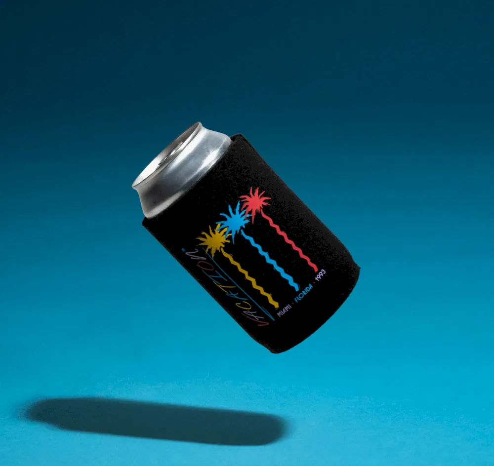 Keep your canned beverages cool, both thermally and aesthetically, with this premium refreshment insulator. Featuring our eclectic “Jazz Palms” design originally produced in 1993 on stretched palm-canvas using pastels.